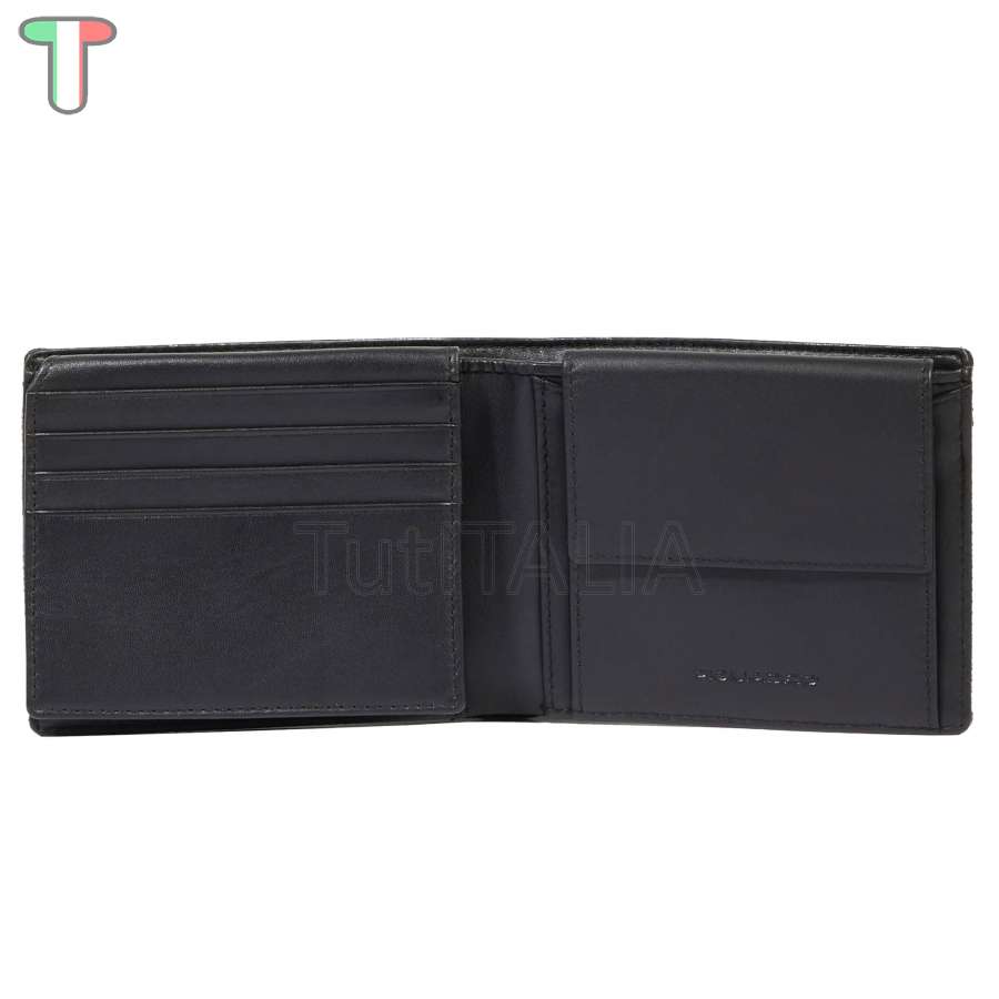 Manufacturer: Piquadro.  Functionality: men's wallet.  Material: leather and fabric.  Color: black.  Number of compartments: 2.  Internal lining: 100% polyester.  Leaflet: perpendicular.  Credit card slots: 6.  Number of leaflets: 1.  Coin compartment: yes.  Dimensions: 11x9x2 cm.  Weight: 0.08 kg.